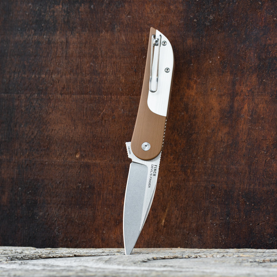 Classic with a rugged twist, the Claymore version of the Devil’s Finger pairs earthy brown and clean white G10 for a timeless, trail-ready look. The satin/stonewashed blade made from 14C28N steel delivers tough, low-maintenance edge retention—ready for your next adventure without breaking the bank.