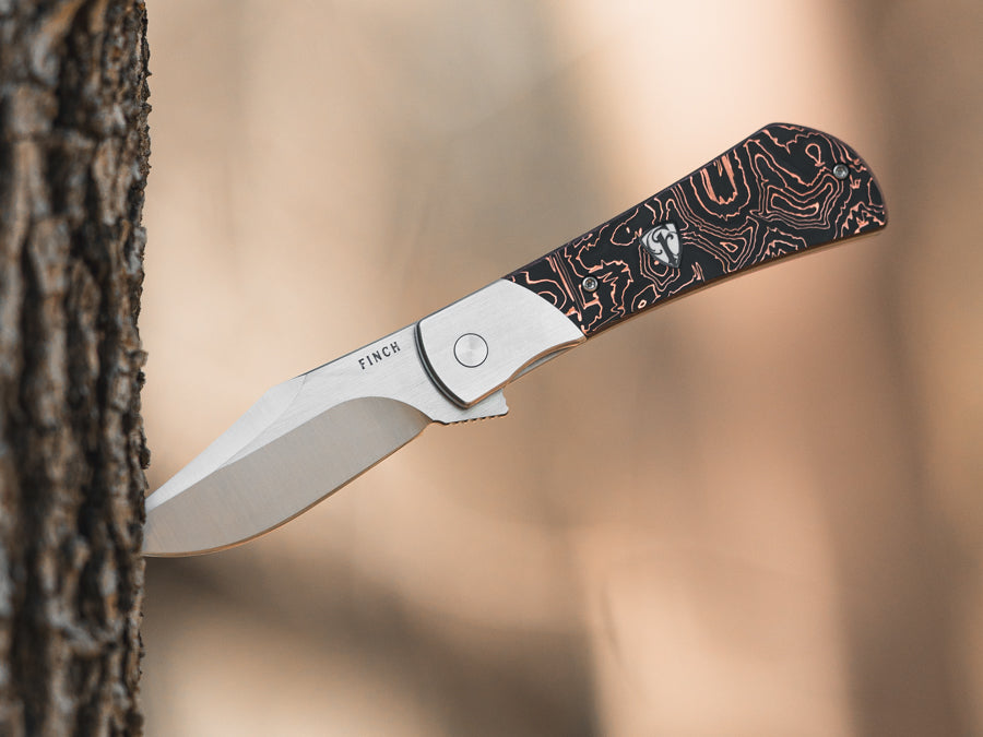 The Flint features a 3 inch blade made from 154CM and has an overall length of 7.2 inches. The Coppertone scales are made from a blend of shredded carbon fiber and copper, making each knife different with a unique pattern.