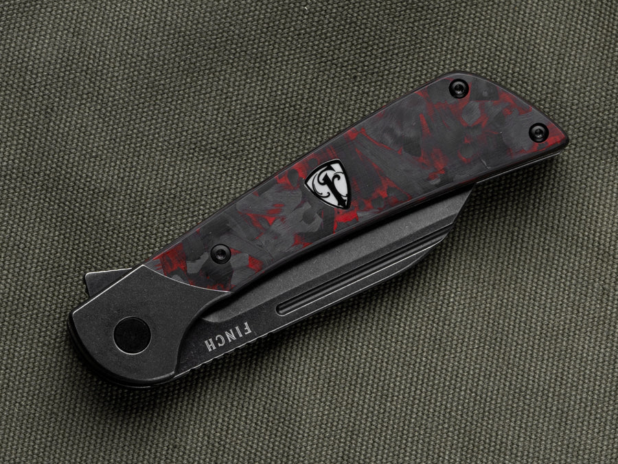 The Sabotage version of the Hellfire has carbon fiber scales and a "blackwash" finish to the steel. This involves a black coating that is then stonewashed to bring back the steel highlights. The Hellfire knives use an integrated liner bolster for the lockup and ride on ballbearings for fast flipping action.