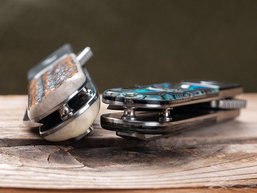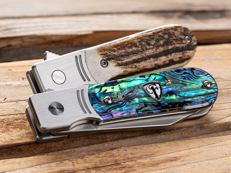 Our stag horn has contoured handle scales, a first for this model, which is why there’s no crystal inlaid. The laser engraving features our "F" emblem. The other version comes with Abalone scales, also a first for the Model 1929. This version has our glowing sapphire crystal in the scales with the Finch lettermark engraved on the blade.