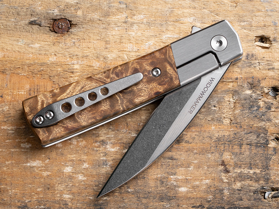 Each Widowmaker features a 2.9-inch blade of 154CM steel and a 6.5-inch overall length—balanced, durable, and ready to work. Choose from four main styles: Arctic Storm Carbon Fiber with Blackwash, Midnight Honey Copper Carbon Fiber with Blackwash, Burlwood with satin and stonewash, and Nightcrawler sawcut bone.