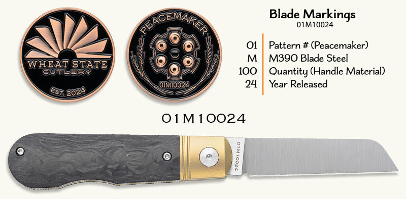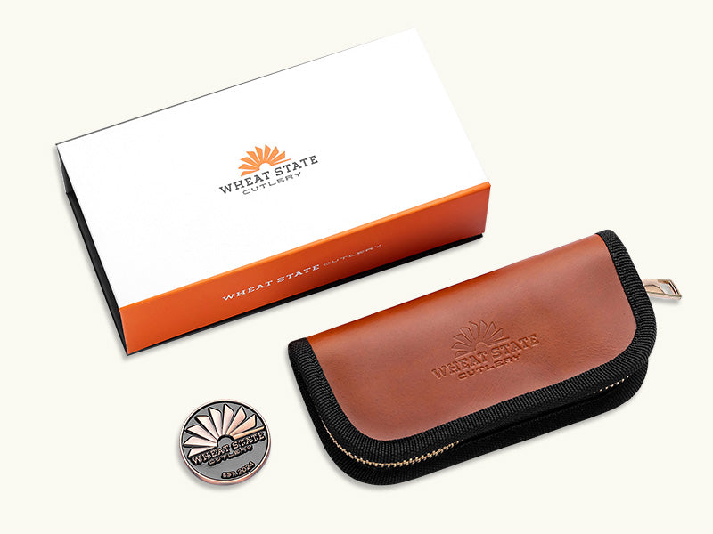 The Wheat State Peacemaker comes with packaging designed to make it even more special. Each knife is stored in a leather zipper pouch inside a sturdy outer box. Along with the knife, you’ll find a collector’s coin that matches the serial number engraved on the blade: 01M10024. This number tells the story of the Peacemaker — 01 for the first Wheat State model, M for the M390 blade steel, 100 for the number made in each handle style (burl wood, carbon fiber, and Red River), and 24 for its release year, 2024. The packaging adds a personal touch to this small batch production.