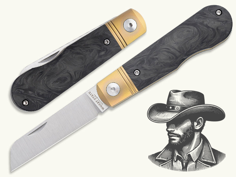Refined yet bold, the Peacemaker in Swirled Carbon Fiber brings unique character with gold-anodized titanium bolsters and a brushed M390 blade. A striking blend of modern style and classic Barlow heritage.